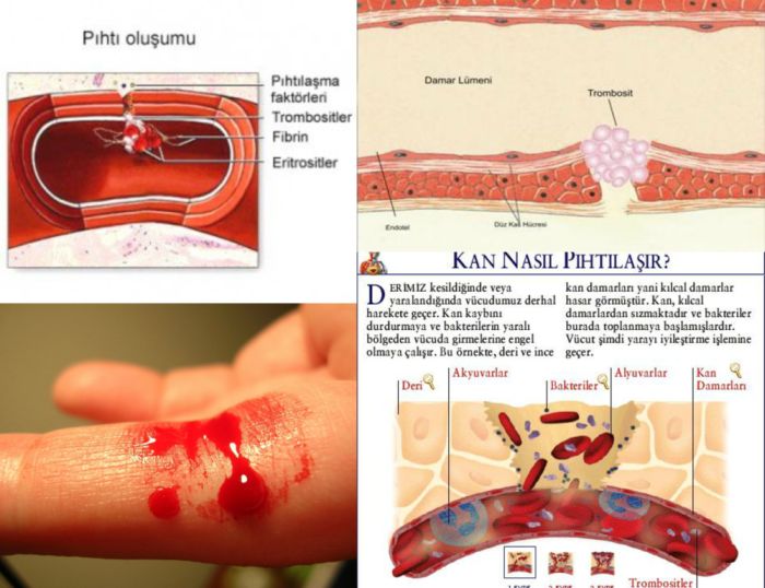 Vücudumuzda bir kesik veya yaralanma olduğunda kanamayı önlemek (Pıhtılaşmayı sağlamak) için ilk olarak hasarlı damar Serotonin salgılayarak büzülür. Böylece kanın akması azalır. Daha sonra kanın içinde dağınık şekilde dolaşan trombositler devreye girer. Trombositlerde özel bir madde salgılayarak diğer enzimlerin bir yerde toplanmasını sağlar. Bu olayı karıncaların bir yerde yem buldukları zaman diğer karıncalarında orada toplanmasına benzetebiliriz.
