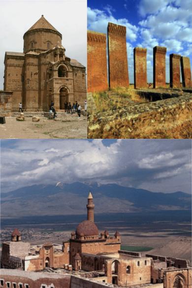 Ani, Hıristiyan Ermeni inanışınca kutsal sayılıyor. Adını İran, Eti ve Roma tanrılarından aldığı söyleniyor. Milattan önce bir kale kenti olarak kurulan Ani, X. yüzyılda Bagrat oğulları sülalesinden Ermeni hükümdarlara başkentlik yapmış. Doğu yönünde Arpaçay’a inen kayalıkların eteğinde Prens Dikran Honents’in yaptırdığı Surp Kirkor Kilisesi bulunuyor. İçi fresklerle süslü kilise oldukça iyi durumda. 1036 yılında yapılmış Surp Pirgiç (Halaskar) Kilisesi ise yörede Keçeli Kilise diye de biliniyor. 1038’de yapılan Surp Hovannes (Apostol) Kilisesi’nden günümüze pek bir şey ulaşamamış. Kuzeybatı tarafında aynı adı taşıyan üç kilise bulunuyor. Bunlardan Surp Kirkor Abugamrents Kilisesi 994’de yapılmış ve Aziz Kirkor Lusaroviç’e adanmış. Kentin ortasındaki kervansarayın ise ancak kalıntısı günümüze kadar gelebilmiş.