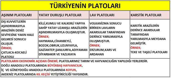 Türkiye bu duruma dış güçle tarafından aşındırılarak peneplen hale gelmiş yüzeylerin 4.zaman başlarında toptan yükselmesiyle erişmiştir. Ancak her yer aynı derece yükselmemiştir. Doğu Anadolu da 2000m olan bu yükselme değeri İç Anadolu da 1000-1500 m , Güney Doğu Anadolu`da 400-800 m, Kocaeli-Çatalca da 200-400 m`ler arasında oluşmuştur. Böylece ülkemizde alçak ve yüksek platolar oluşmuştur. Bunlara en çok İç Anadolu da rastlanır. Kimi platolar peneplen (yontukdüz) yüzeylerin yükselmesiyle, kimileri karstlaşımayla, bir bölümü de volkanik etkilerle oluşmuştur. Bu platoların beşeri ve ekonomik değerleri fazladır .