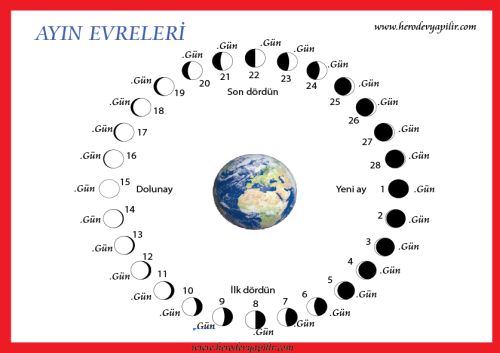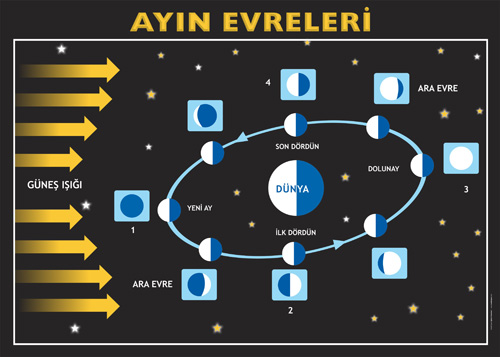 Bundan sonra güneşten uzaklaşması altı burcu aldığında (180 derece) aydınlık yüzü tamamen görünür. İşte bu dolunay'dır. Artık güneşin tam karşısındadır.