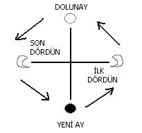 Böylece her gün 12-13 derece güneşten uzaklaştıkça aydınlık tarafının bize eğimi artar. Güneşten uzaklaşması üç burcu aldığında (90 derece) ışıklı yüzünün yarısını görürüz. İşte bu ilk dördündür.
