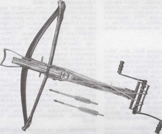 Eskiden yayın değişik bir türü olan arbalet, daha sağlıklı ve daha güçlü bir atış sağlar Başlıca parçalan, tahta, boynuz ya da çelikten bir yay ile bu yayı taşıyan tahtadan bir destek, yani kundak’ tır. Yayın kirişi bir aletle gerilir ve kundakta, içine okun yerleştirildiği uzunlamasına bir yarık açılmıştır. Kundağın ortasında, bir mil üzerinde dönen ve kertiklerinden biri, gerilmiş durumdaki yayın kirişini tutan kemikten ya da çelikten bir çark vardır. ilk kez IV. yy.'da Vegetius tarafından anılan, X. yy.'da kullanıldığı bilinen, ancak, Laterano konsili’nde (1139) kabul edilemez ve çok korkunç bir silah olarak yasaklanan arbalet, XVI. yy.’a kadar kullanıldı. Menzili 200 adım (150 m), etkili menzili 100 adımdır (75 m); arbaletin okları zırhı delemezse de kimi kez öldürücü darbelere neden olabilir. Arbalet, bir ya da birden fazla kişi tarafından kullanılır. XIII. yy.'da elle gerilen (el arbaleti) ya da bir üzengiyle yere tesbit edilen ve bir kriko, bir çengel ya da kurmalı bir aletle ya da çok ağırsa bir palangayla gerilen ar- baletle omuza dayamadan nişan alınır, çünkü geri tepmesi yoktur. Silah yanağa dayanır, bir nişangâh yardımıyla hedefe nişan alınır ve tetiğe basılarak kiriş ve ok serbest bırakılır.