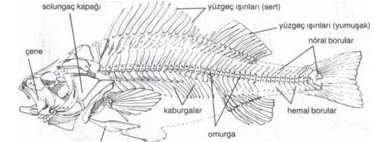 iskelet, balığın hareket sisteminin bir parçası olduğu kadar, yaşamsal organları korumaya da yarar. Eksenel iskelet omurga ve uzantılarından oluşur. Yüzgeç destekleri, kemik dokusundan ya da epitel dokudan türemiştir. Köpekbalıkları ile vatozların iç iskeleti kıkırdaktandır. Birçok fosil grubunun ve bugün yaşayan bazı ilkel balıkların iç iskeleti, büyük ölçüde kıkırdaktan oluşmakla birlikte, yer yer kemiklere de rastlanır (örn. köpekbalıkları). İlk omurgalılarda, omurganın yerinde, çok sağlam, lifsi yapıda bir kılıfla sarılmış, özelleşmiş hücrelerden oluşan ve omurga taslağı olarak kabul edilen bir sırtipi (notokord) bulunuyordu. Bugünkü balıkların evrimi sırasında, sırtipinin yerini bir ölçüde kıkırdak, daha sonra da kemikleşmiş kıkırdak almıştır. Kemiklibalıklarda ise, sırtipinin yerini alan makara biçiminde omurlar bulunur. Kafa iskeleti, kemiklibalıklarm solungaç kemerleri ve çeneleriyle birlikte bütünüyle ya da en azından bir ölçüde kemikleşmiştir. Köpekbalıklarının ve vatozların kafa iskeleti kıkırdaklıdır. Kıkırdağın yerini, kimilerinde yer yer kalsiyum katmanları alırsa da hiçbir zaman gerçek kemik oluşumu görülmez.